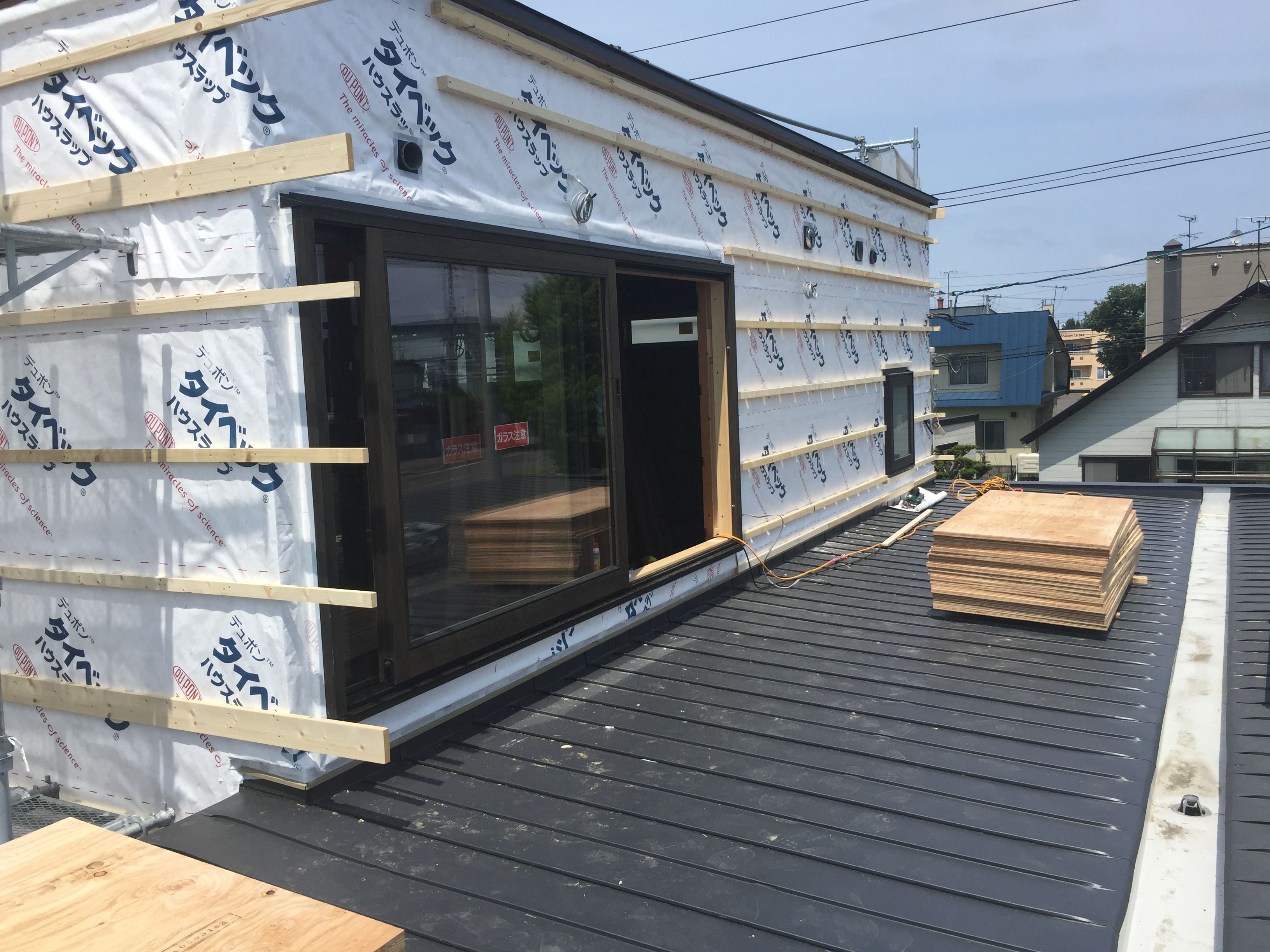 リノベーションの住宅では、窓が取付られ、外壁の下地作業をしています。 最近は天候が不順のため、雨水の浸入などが無いように気をつけながら、作業を進めています。 窓も取付けられ、屋根工事も完…